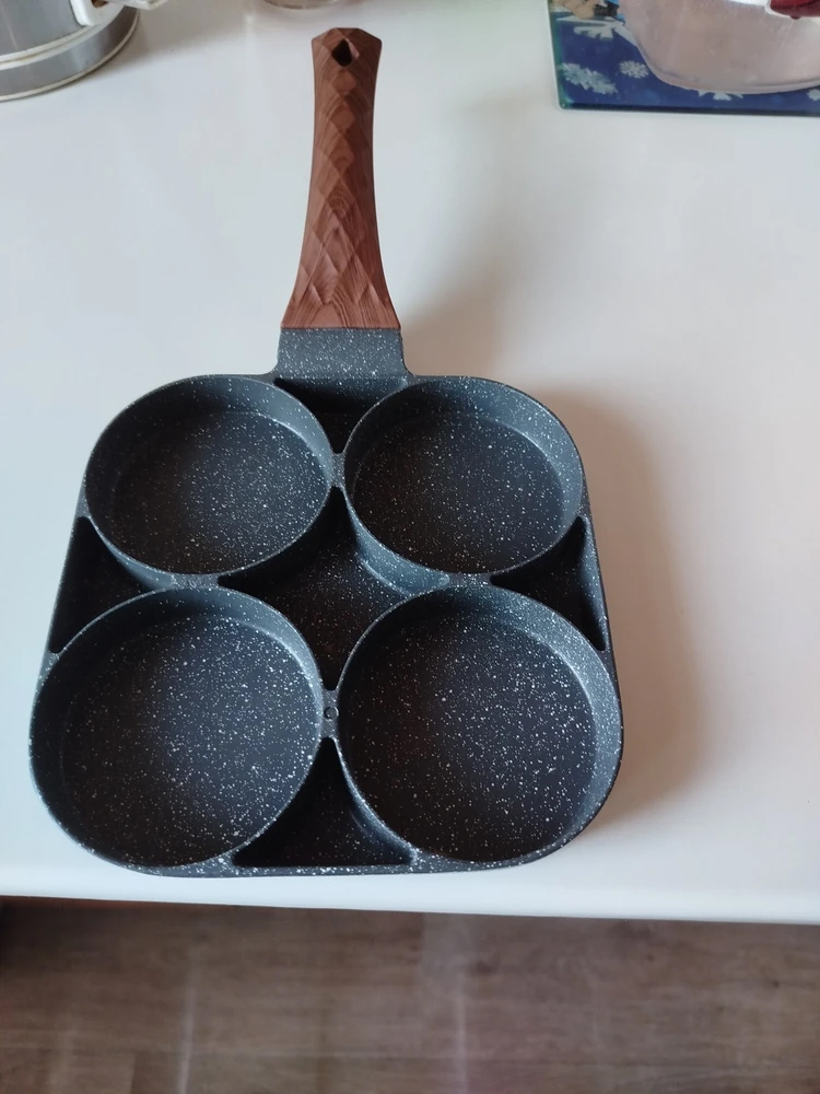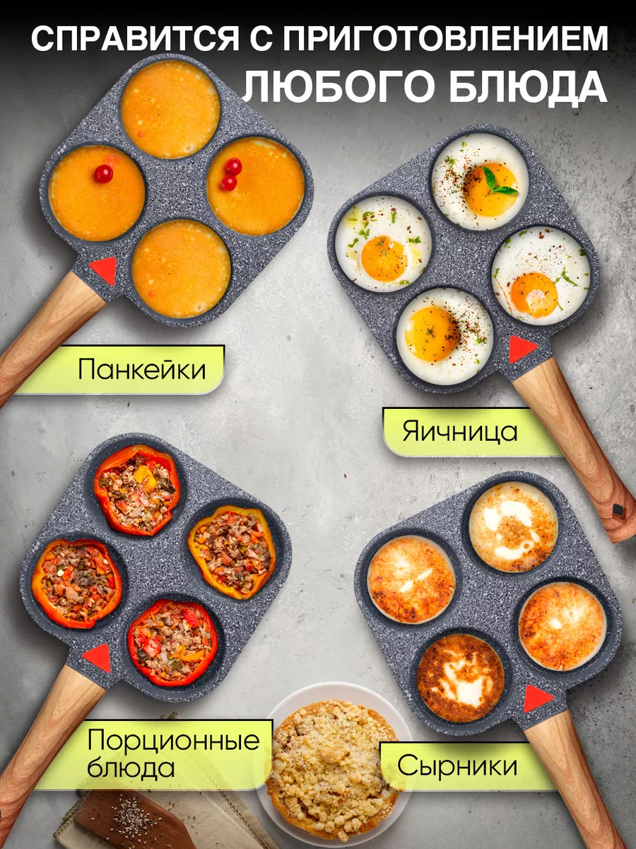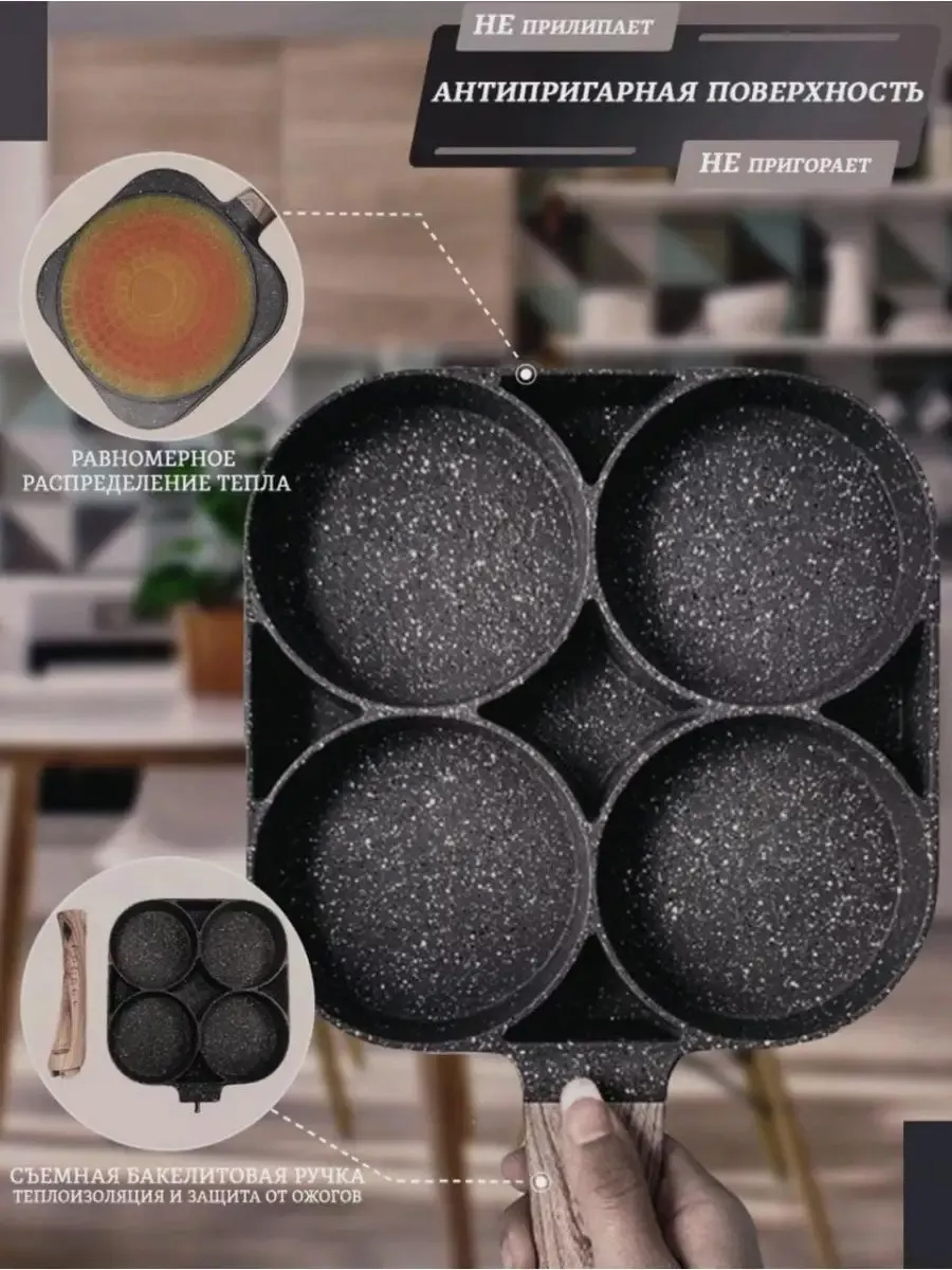 Эргономичная ручка с защитным покрытием от нагревания предотвращает риск ожогов, обеспечивая безопасность и комфорт во время готовки. Каждая секция сковороды предназначена для равномерного приготовления пищи, будь то яичница, оладьи или блины. Это делает сковороду незаменимым помощником на кухне.