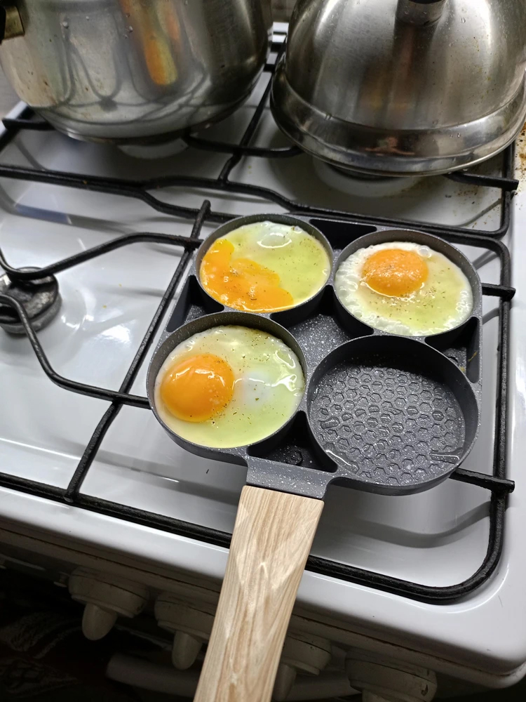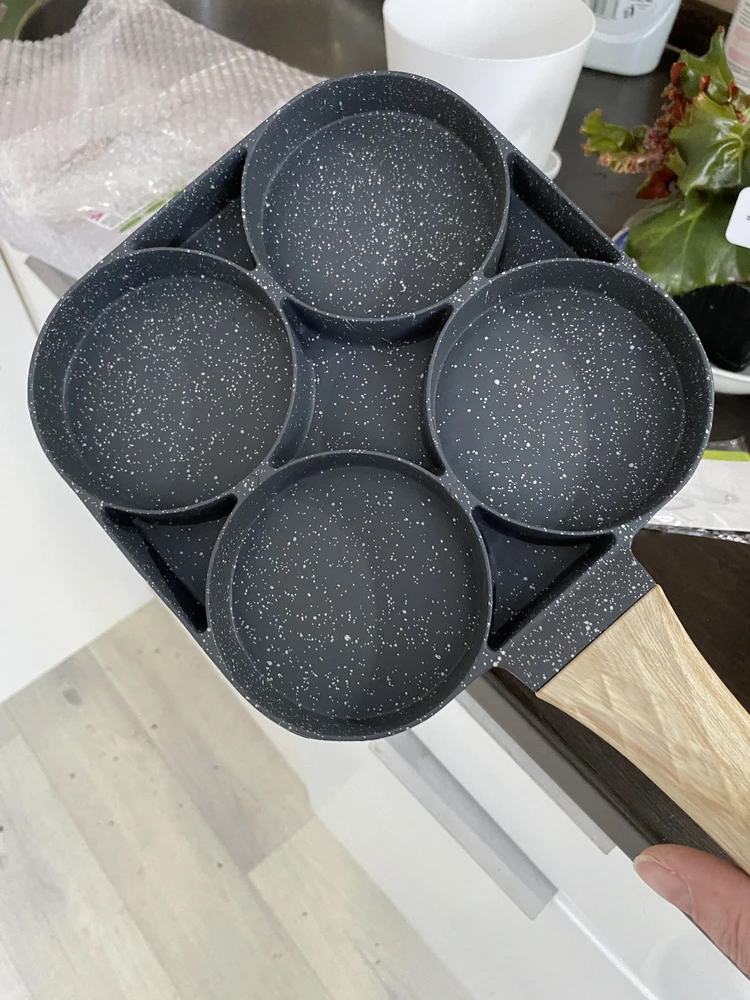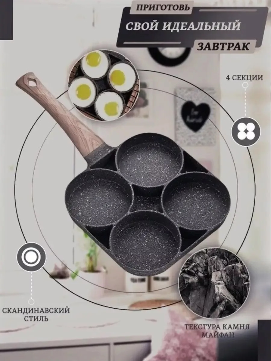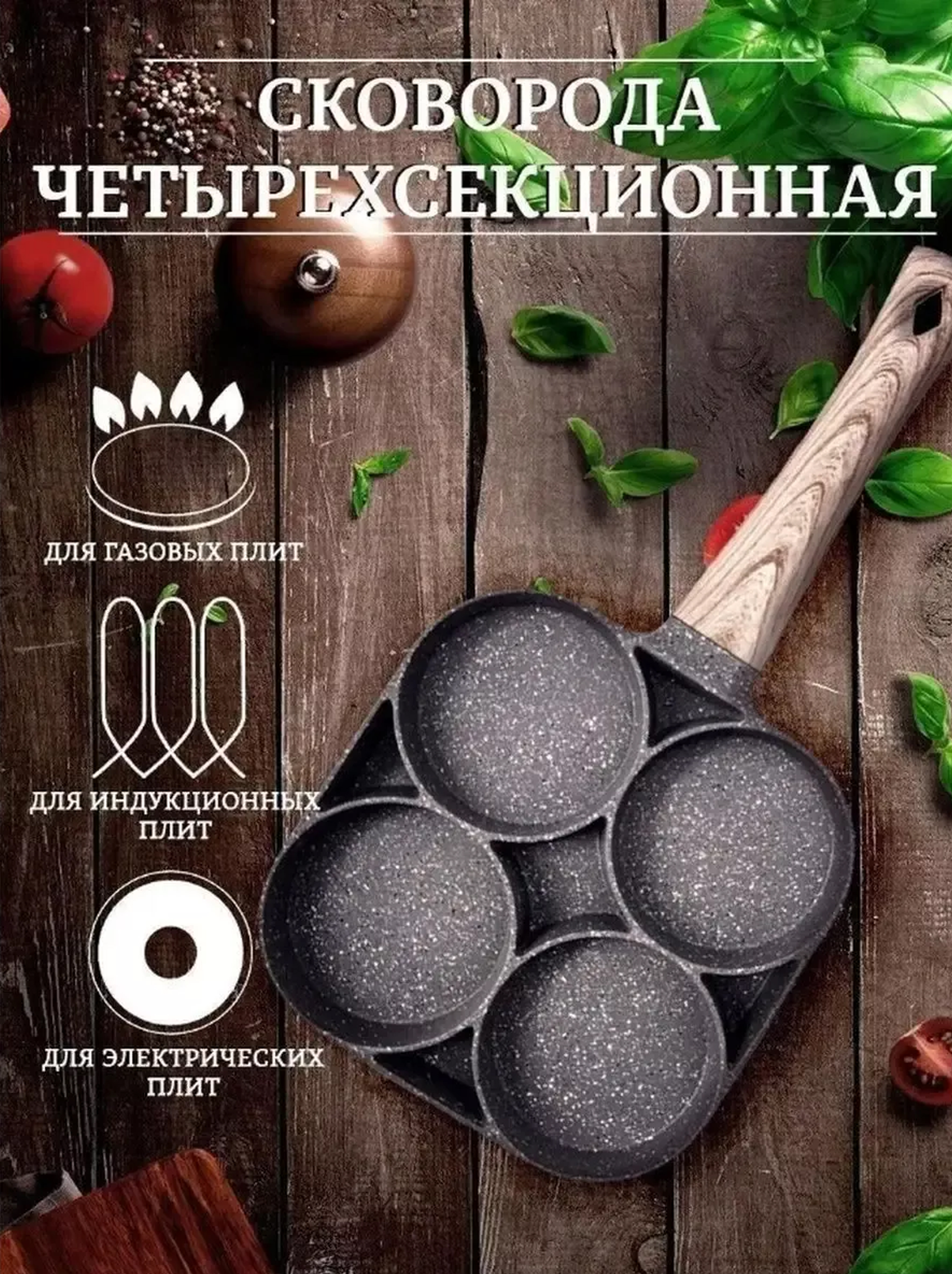 Эргономичная ручка с защитным покрытием от нагревания предотвращает риск ожогов, обеспечивая безопасность и комфорт во время готовки. Каждая секция сковороды предназначена для равномерного приготовления пищи, будь то яичница, оладьи или блины. Это делает сковороду незаменимым помощником на кухне.